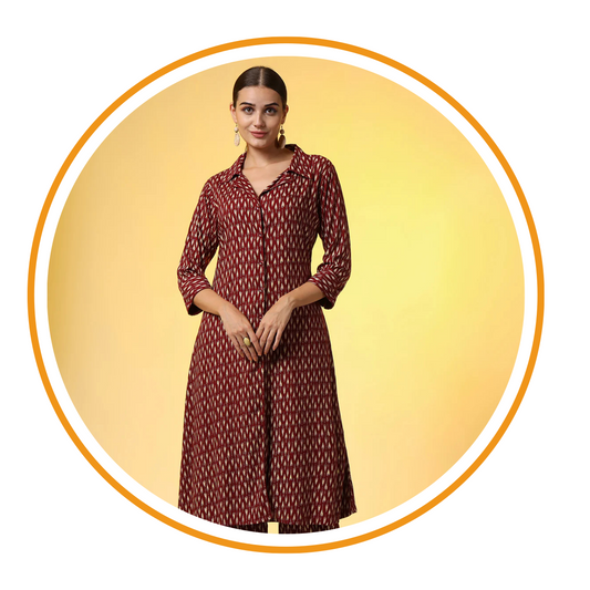 "Sufiza" Chikankari Viscose Rayon and Ajark Print Shirt S4000Balck and Maroon Ajrak Prints casual shirt with Hand work Chikankari, has a spread collar, button placket, long drop-shoulder sleeves, curved hem "Sufiza" Long Shirt with Hand Embroidery women shirt Neck Line: Shirt Collar Style Style: Office/Casual Wear Model Height: 5.7" Length: 36 Inches...- Rs. 1,350.00