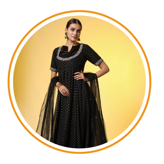 The "SUFIZA" Viscose Rayon Foil Printed Dress with Dupatta is designed for party wear. Made from foil print viscose rayon, this elegant dress comes in a navy blue color. It has a length of 56 inches and features 17-inch sleeves with a round neckline....- Rs. 4,599.00