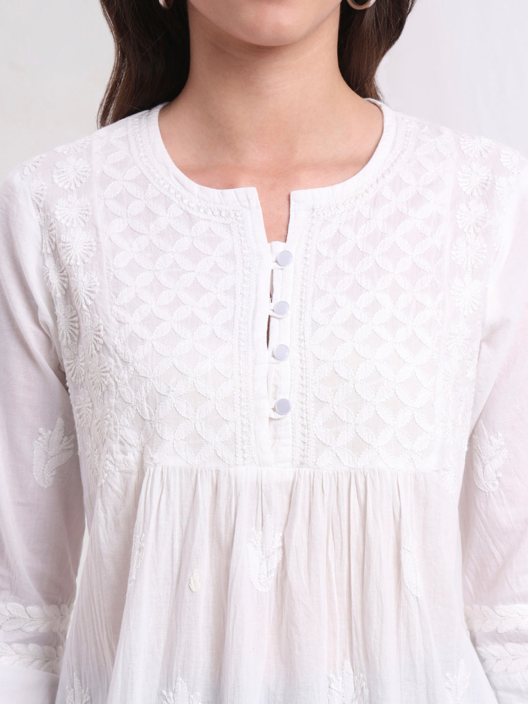 The "SUFIZA" a White Cotton kurti with Delicate hand chikankari embroidery from Lucknow, suitable for both formal and daily wear.