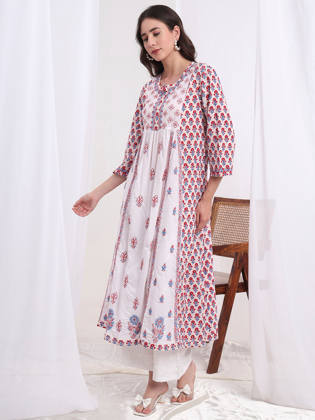 "Sufiza" white and Hand Block Print Chikankari Embroidery Kurta |
