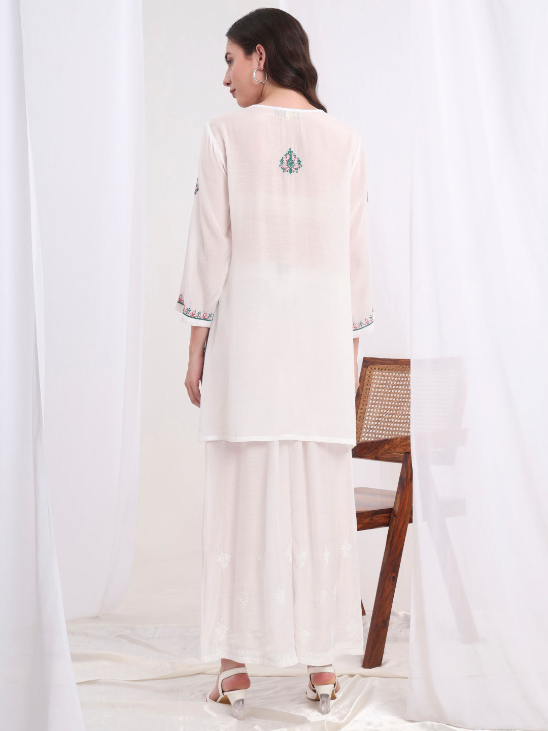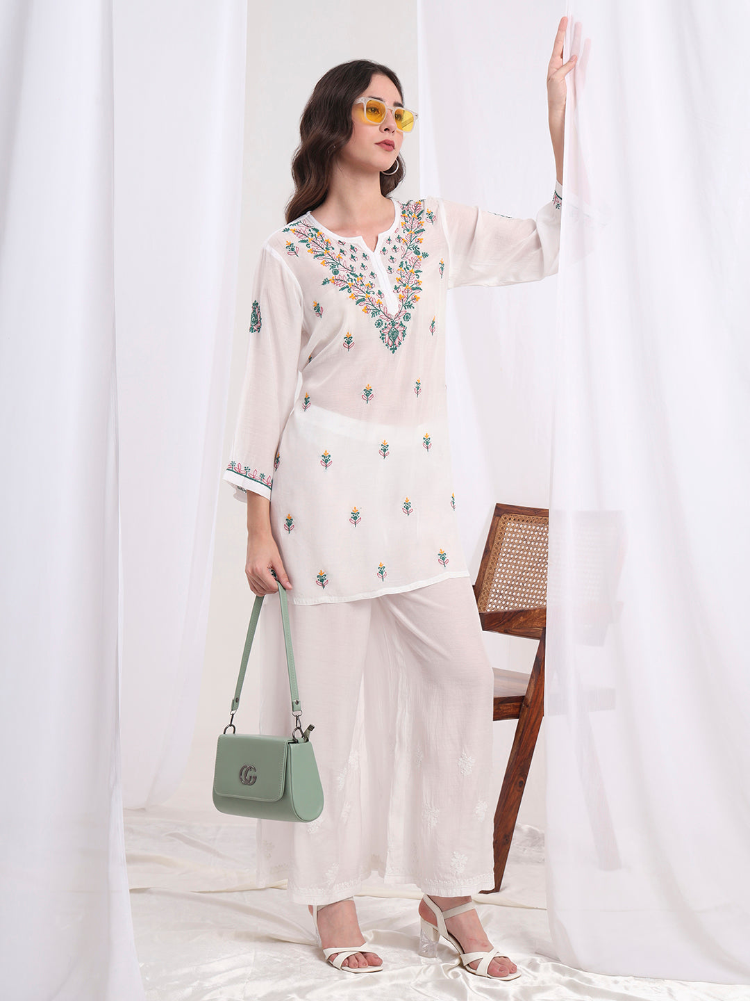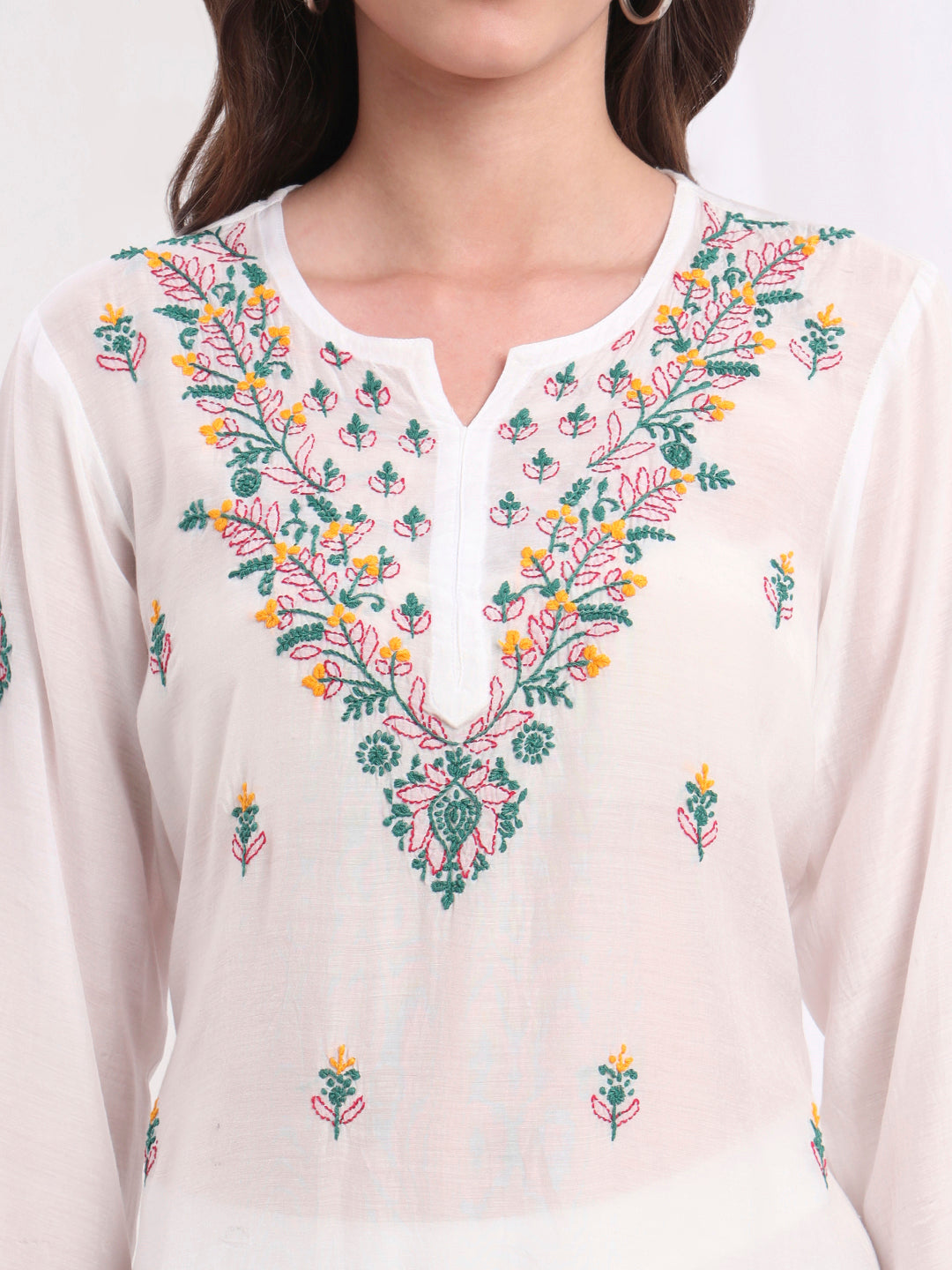 Chikankari Muslin White with Three Color Emboidery Kurti S1009
