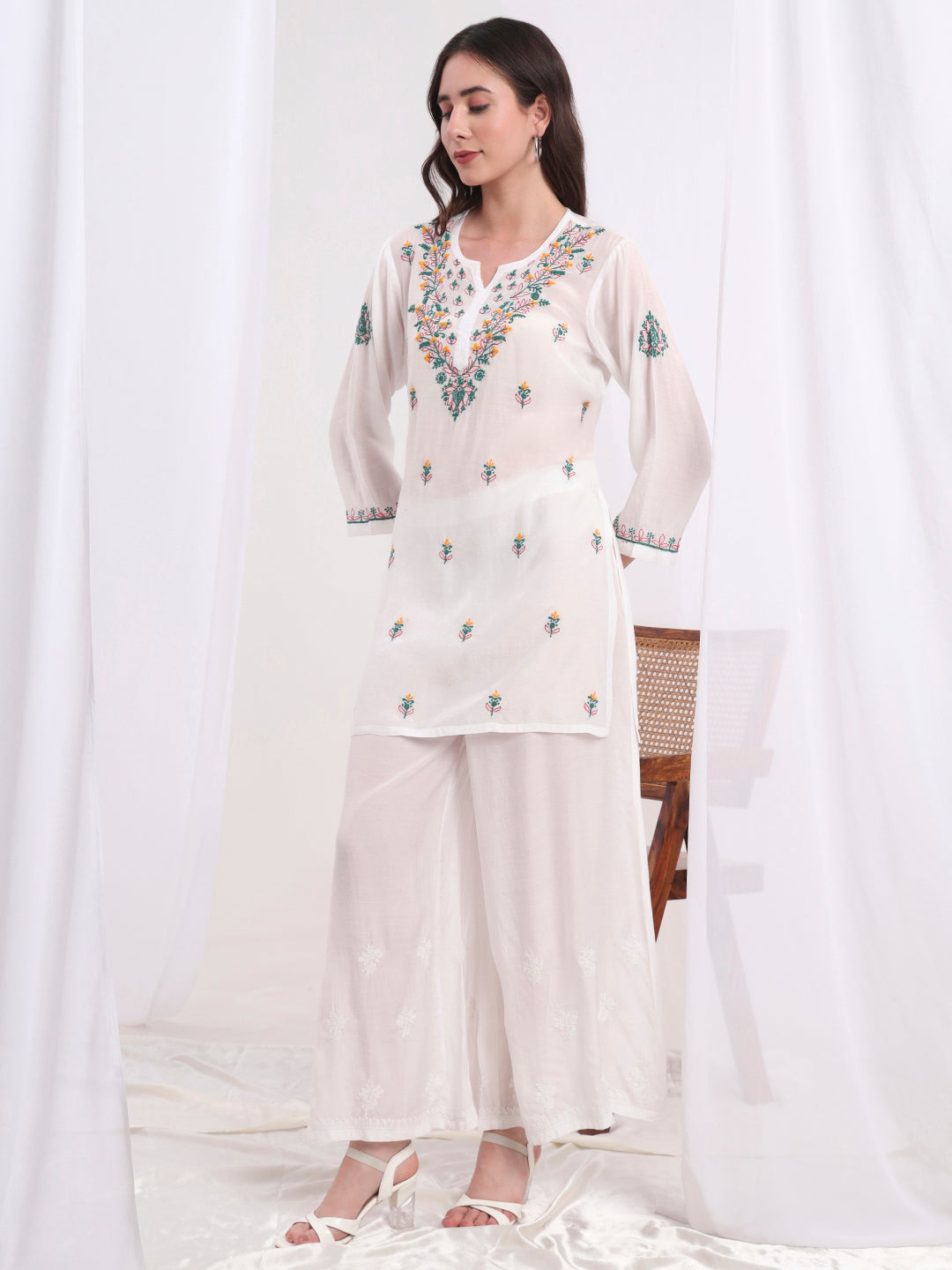 The "SUFIZA" a White Muslin with Delicate hand chikankari embroidery Kurti style from Lucknow, suitable for both formal and daily wear.
