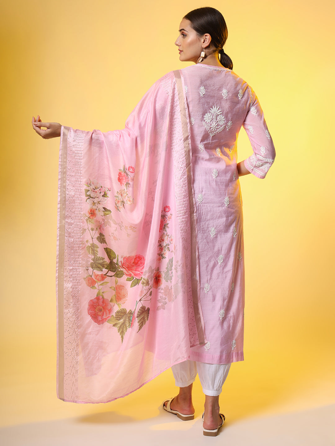 | "SUFIZA" Chikankari Dupatta Set Pink Chanderi Kurta |