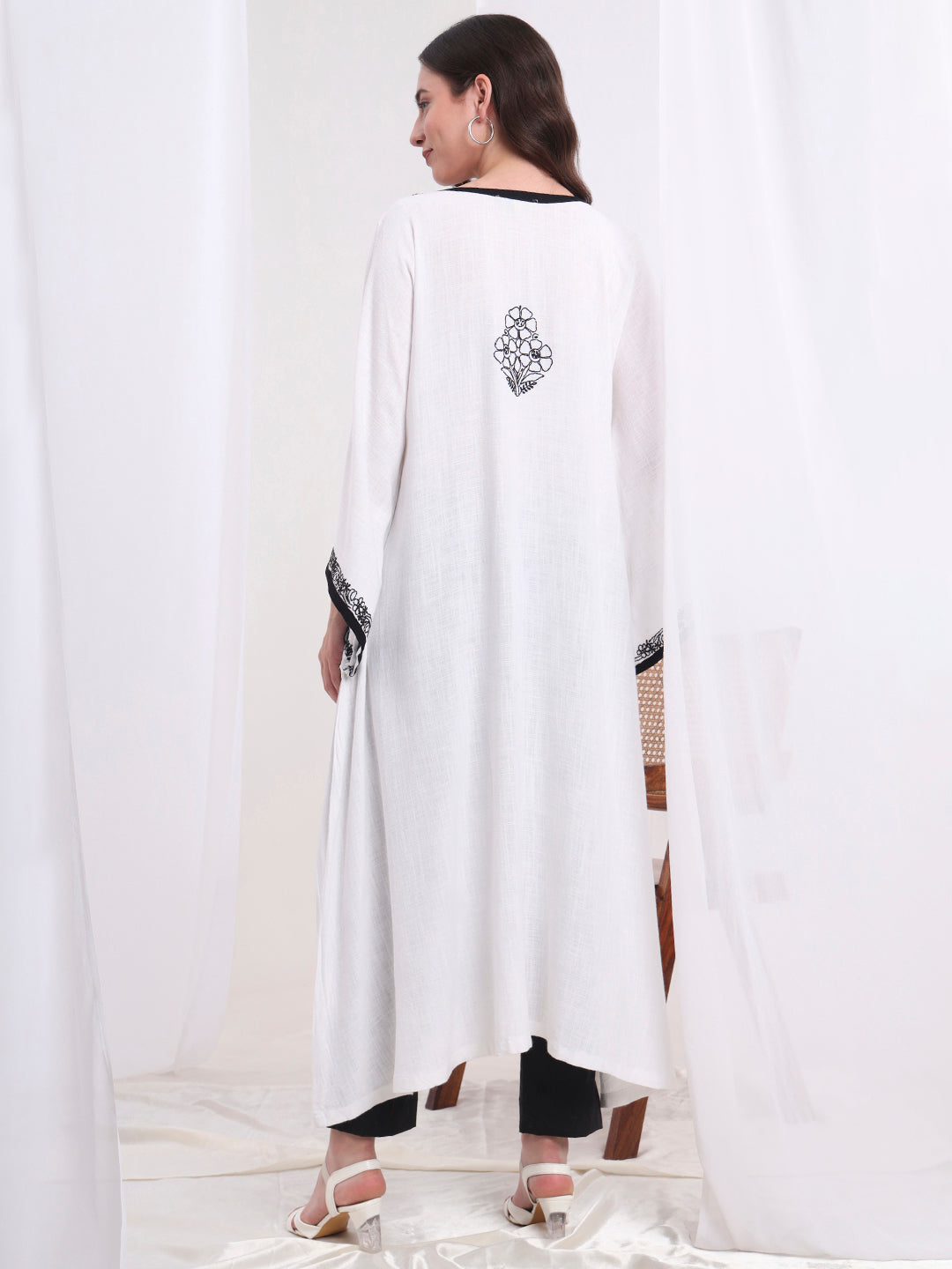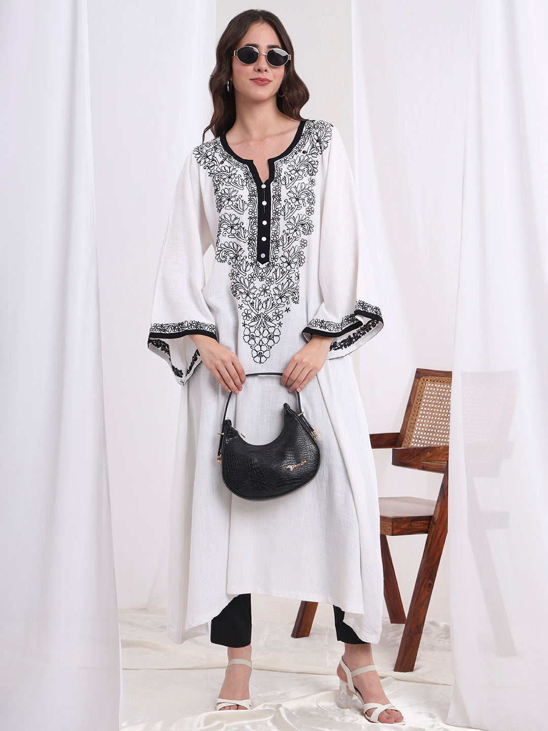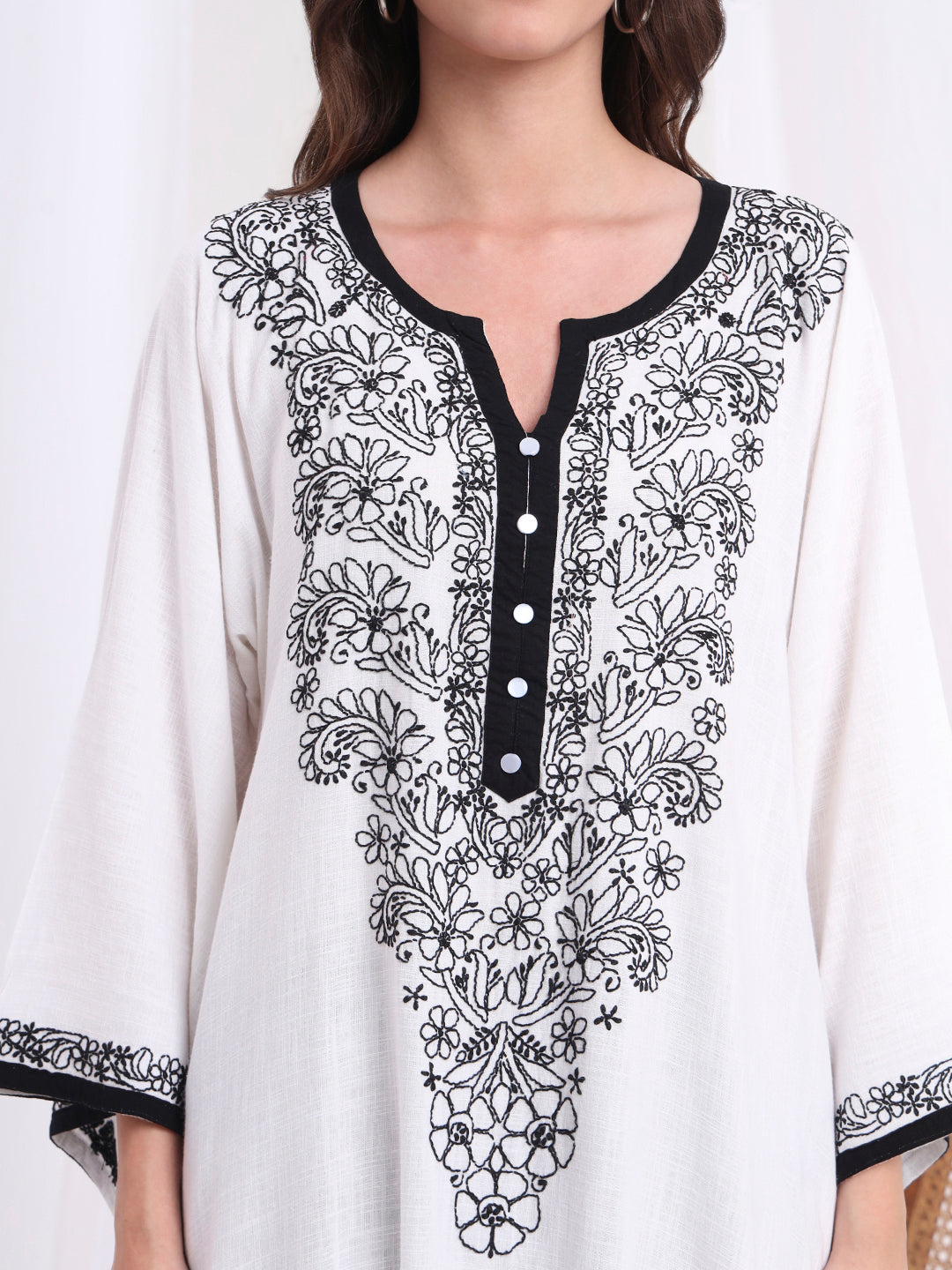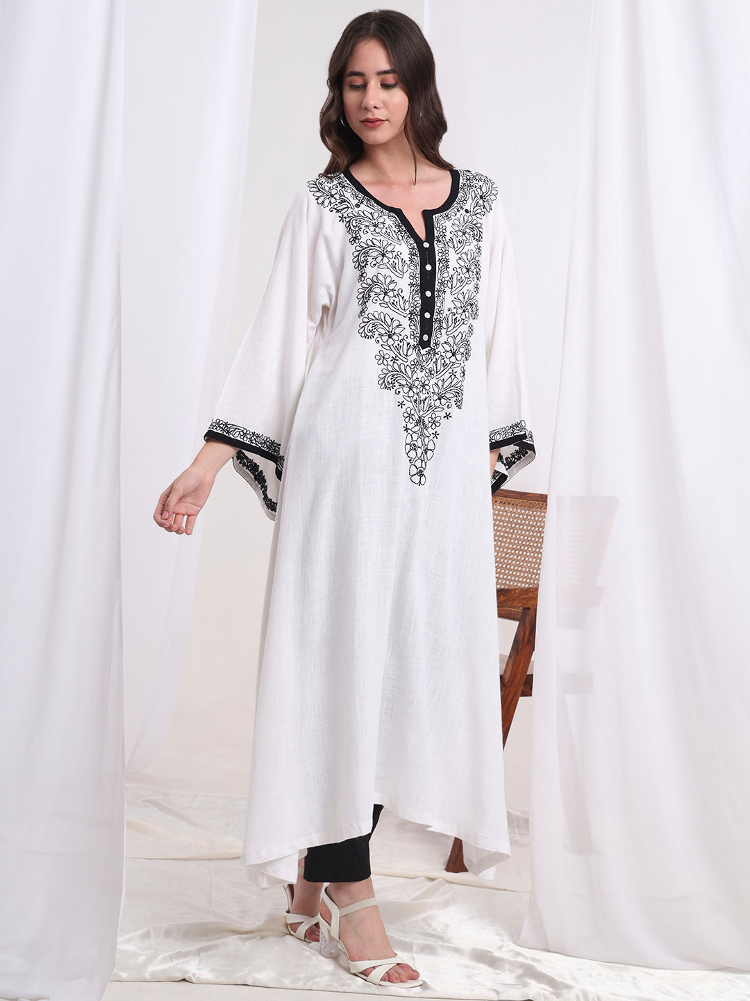 The "SUFIZA" a White Organic Cotton with Delicate hand chikankari embroidery Kaftan Style Kurta style from Lucknow, suitable for both formal and daily wear.
