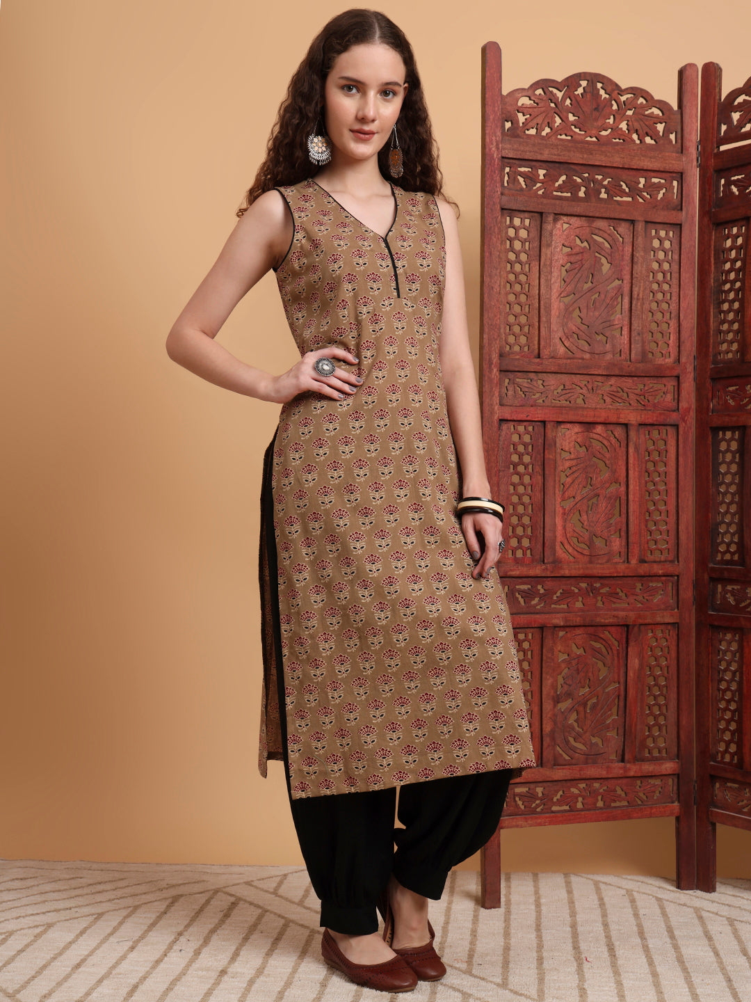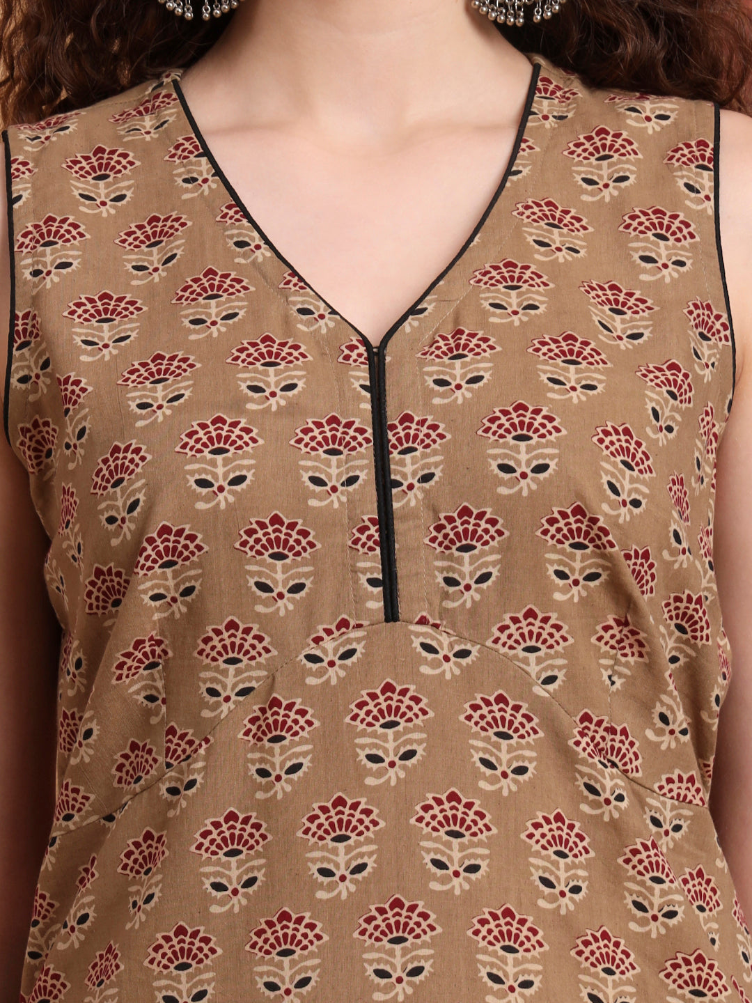 The "SUFIZA" Hand Block Ajraj Print Beige Color with beautiful flower motif Kurta is perfect Office Wear. The Kurta is 46 inches long A-line Style. Perfect Kuta to look different in the crowd.