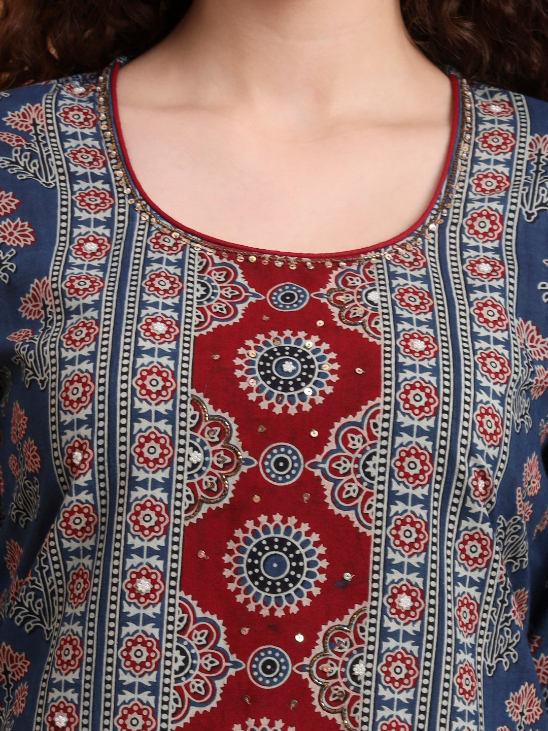 The "SUFIZA" Full length Blue Color with beautiful flower motif Ajrak Prints Kurta is perfect Office Wear. The Kurta is 46 inches long A-line Style. Perfect Kuta to look different in the crowd.