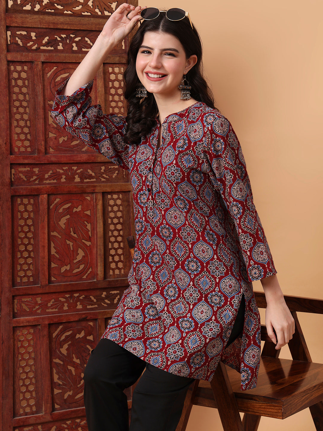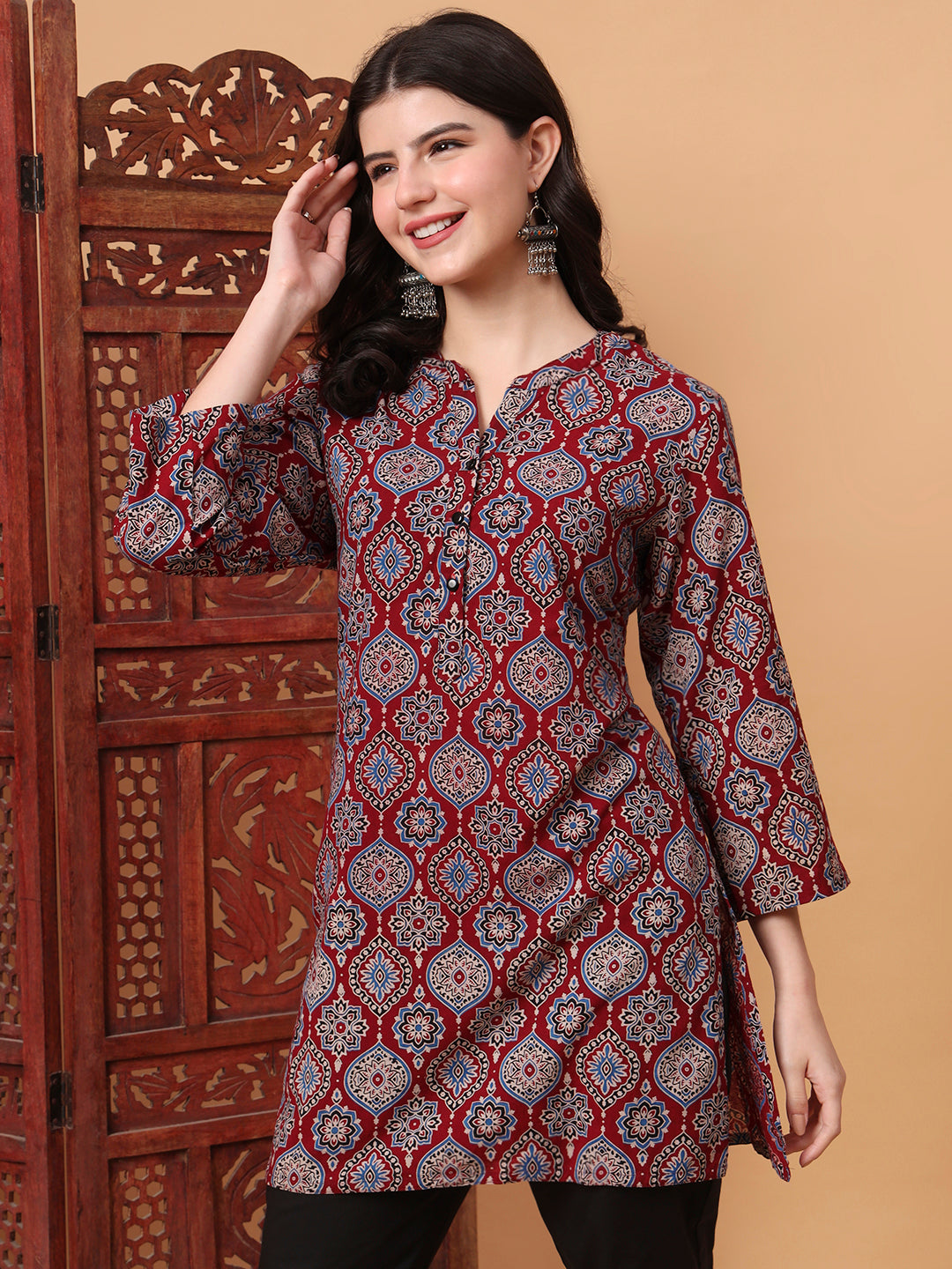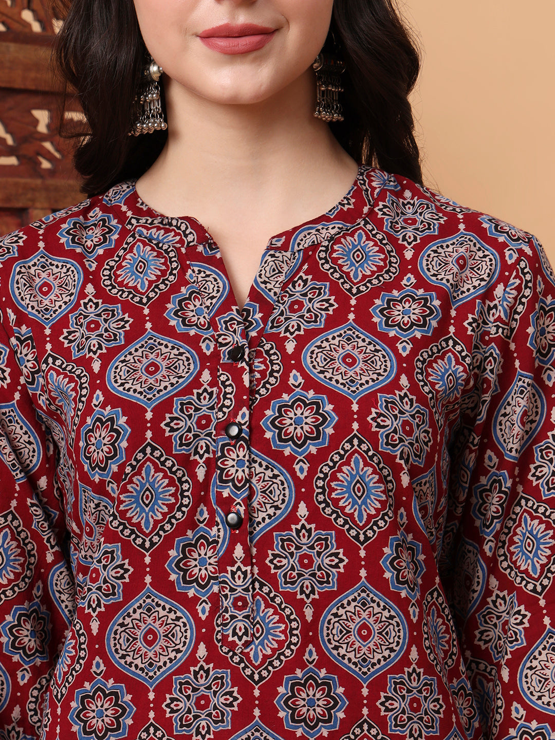 The "SUFIZA" Hand Block Ajrak Print Kurti in maroon color 36-inch cotton piece featuring a collar neck, suitable for both formal and daily wear.