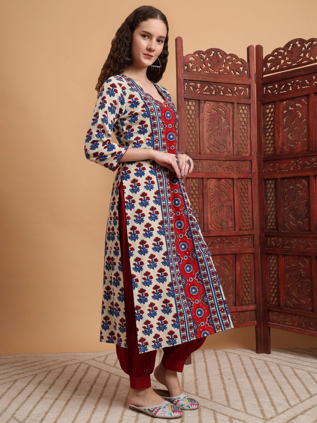 The "SUFIZA" Full length White Color with beautiful flower motif Ajrak Prints Kurta is perfect Office Wear.  The Kurta is 46 inches long A-line Style. Perfect Kuta to look different in the crowd.