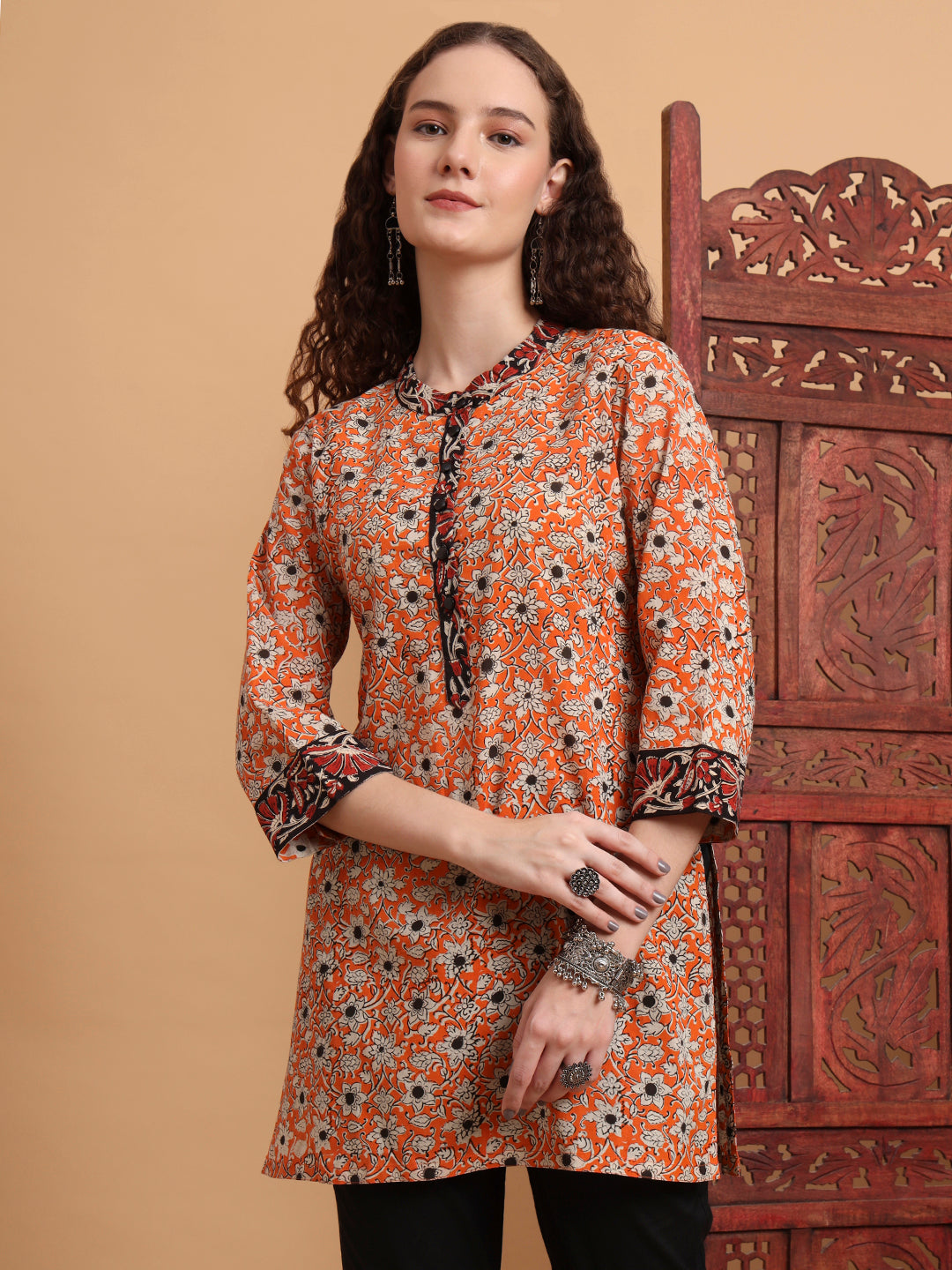 The "SUFIZA" Hand Block Print Orange Color with beautiful flower motif Kurti is perfect Office Wear.  The Kurta is 34 inches long A-line Style. Perfect Kuta to look different in the crowd.