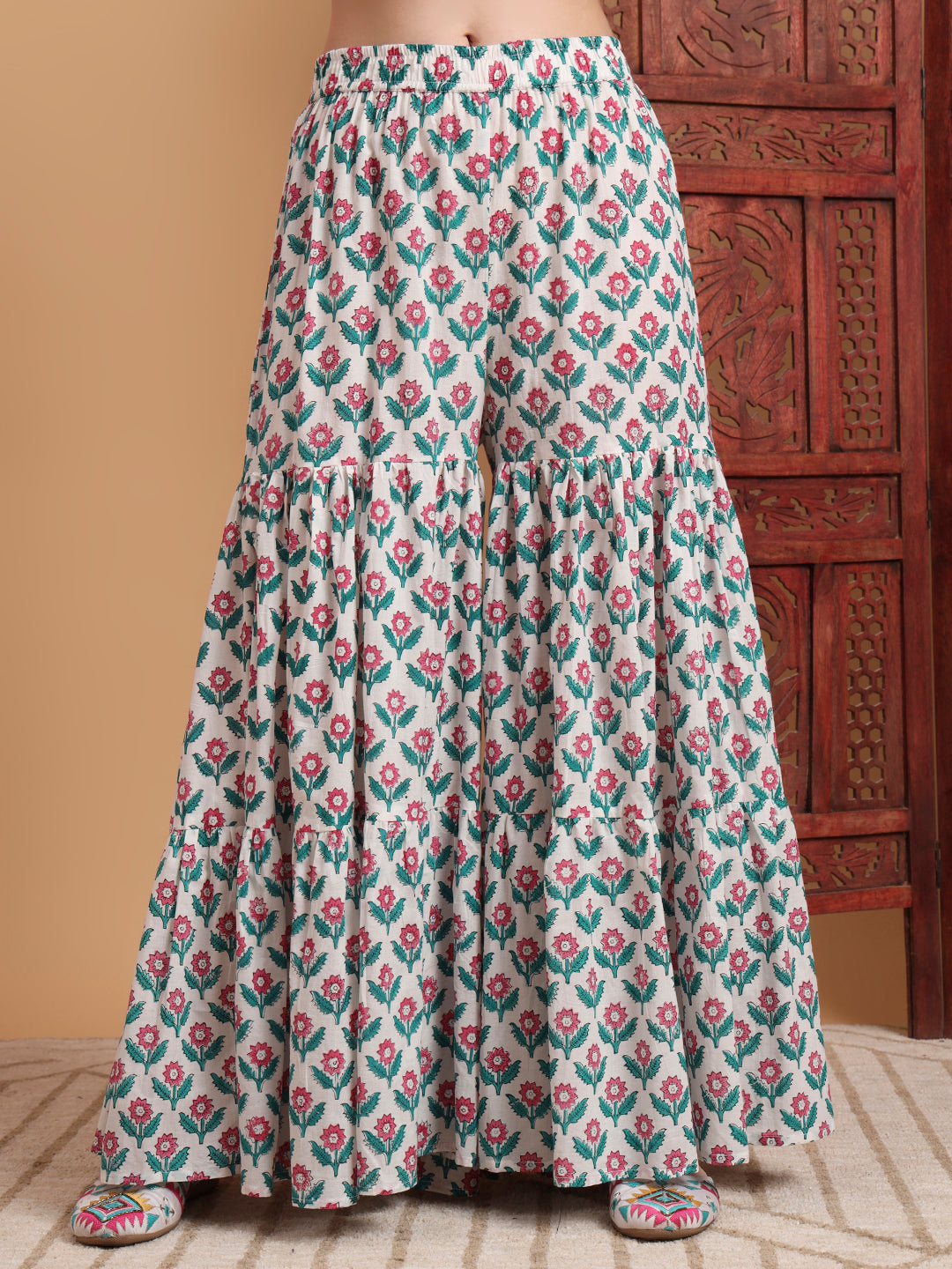 The "SUFIZA" Hand Block Print White Color with beautiful flower motif Sharara Set is perfect Office Wear. The Kurti Length is 34 inches and Bottom Length is 40 inches Style. Perfect Kurta Set to look different in the crowd.