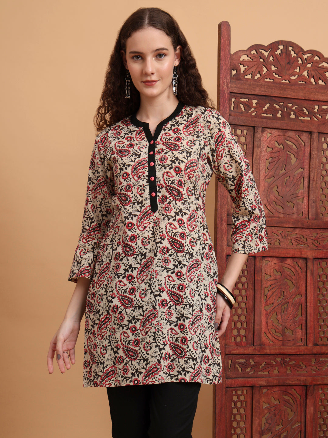 The "SUFIZA" Hand Block Print Cream Color with beautiful flower motif Kurti is perfect Office Wear. The Kurta is 34 inches long A-line Style. Perfect Kurta to look different in the crowd.