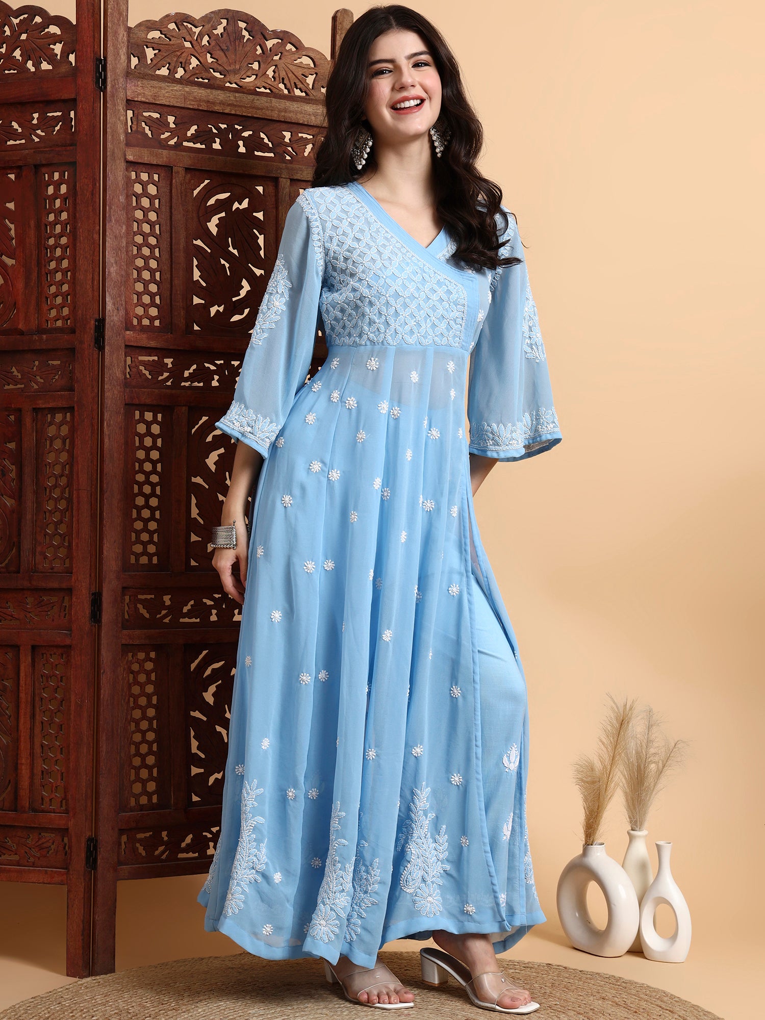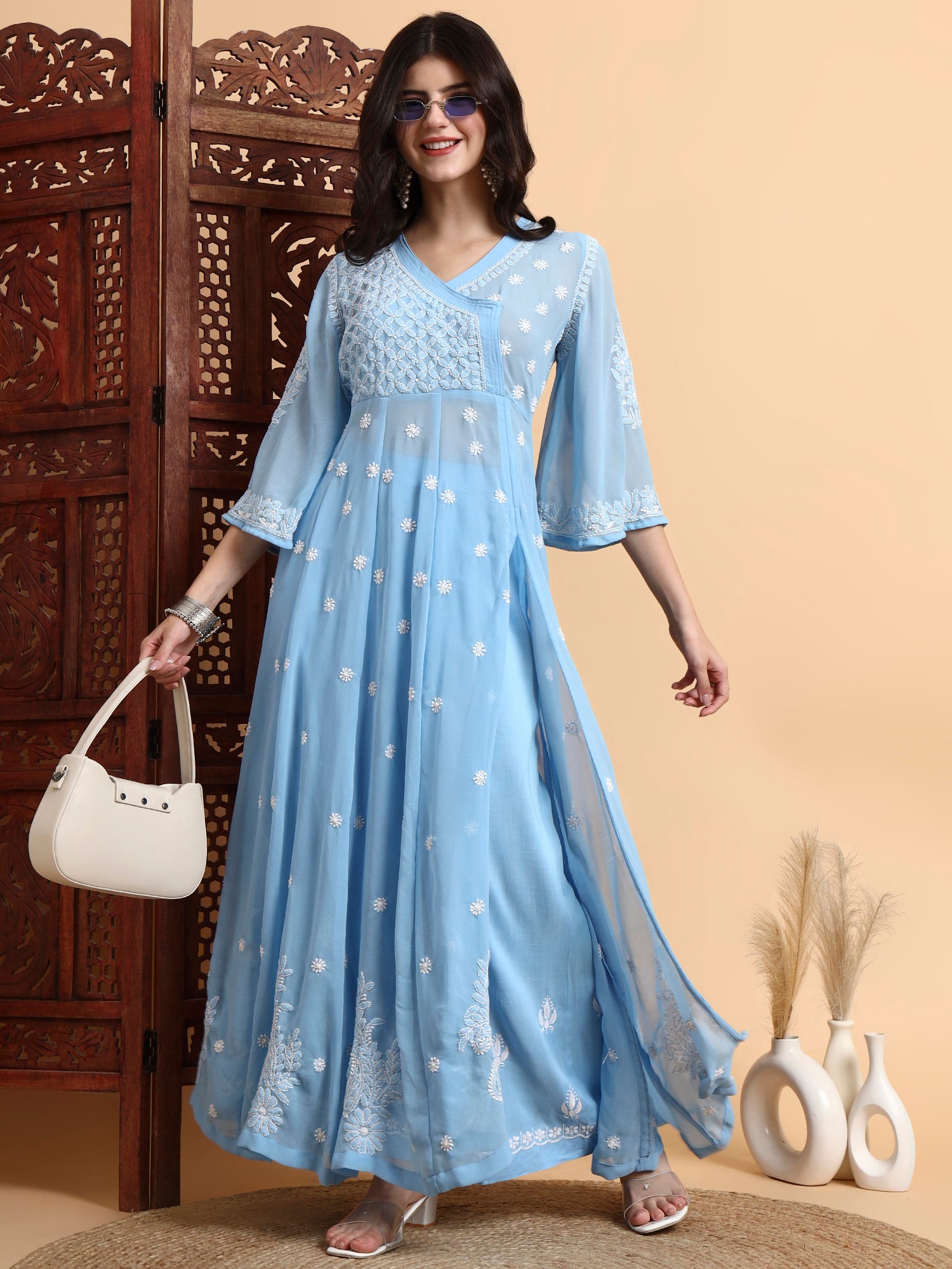 The “SUFIZA” Chikankari Georgette Kalidar Kurta Set is a graceful blend of traditional craftsmanship and contemporary elegance, making it perfect for party wear, festive occasions, and special gatherings. Crafted from premium Georgette fabric, this kurta set features delicate white hand embroidery done in classic Bakhiya Chikankari techniques, giving it a refined and luxurious appeal.
