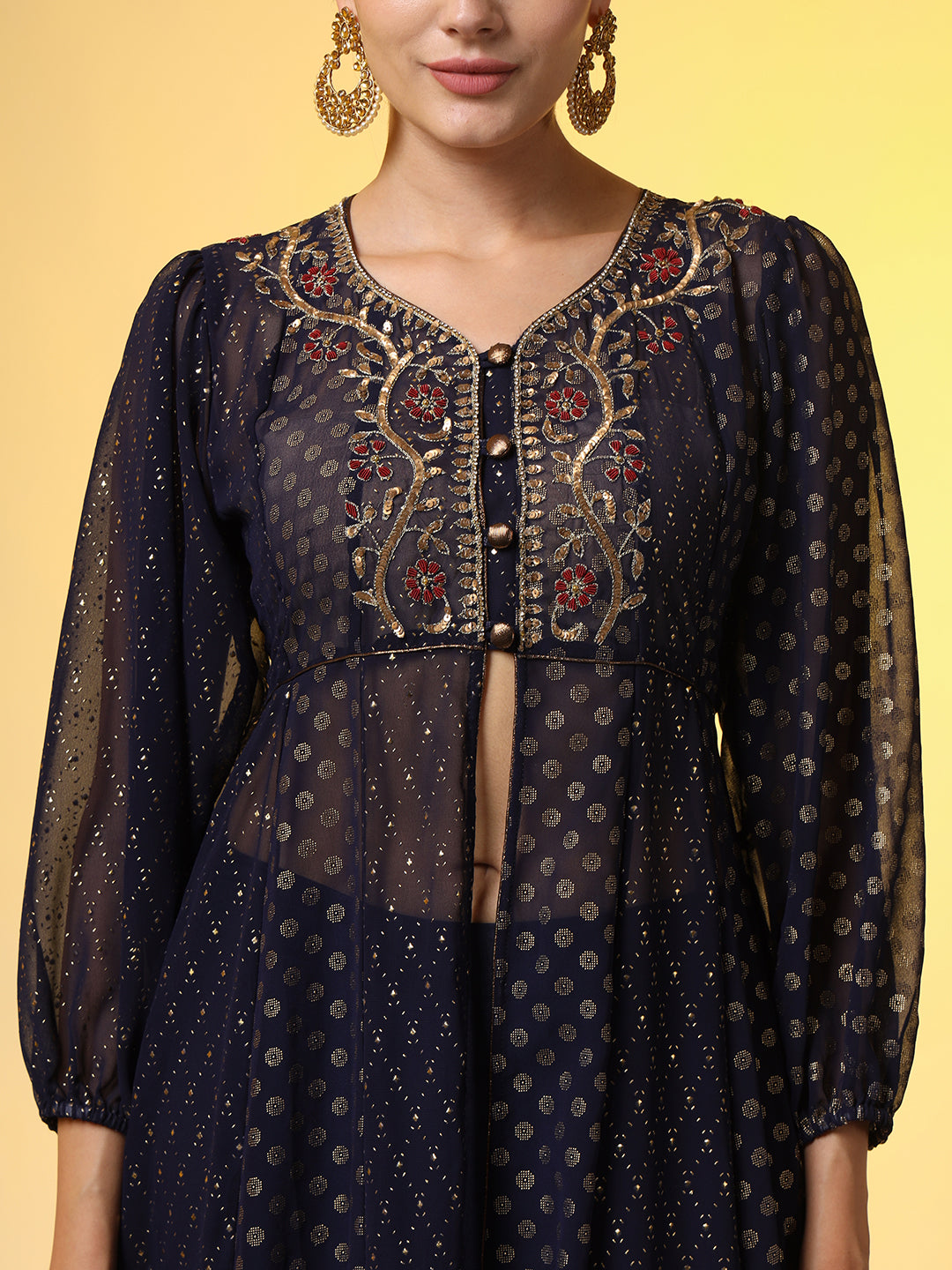 | "SUFIZA" Zardosi Hand Embroidery Georgette Foil Print Ethnic Dress |