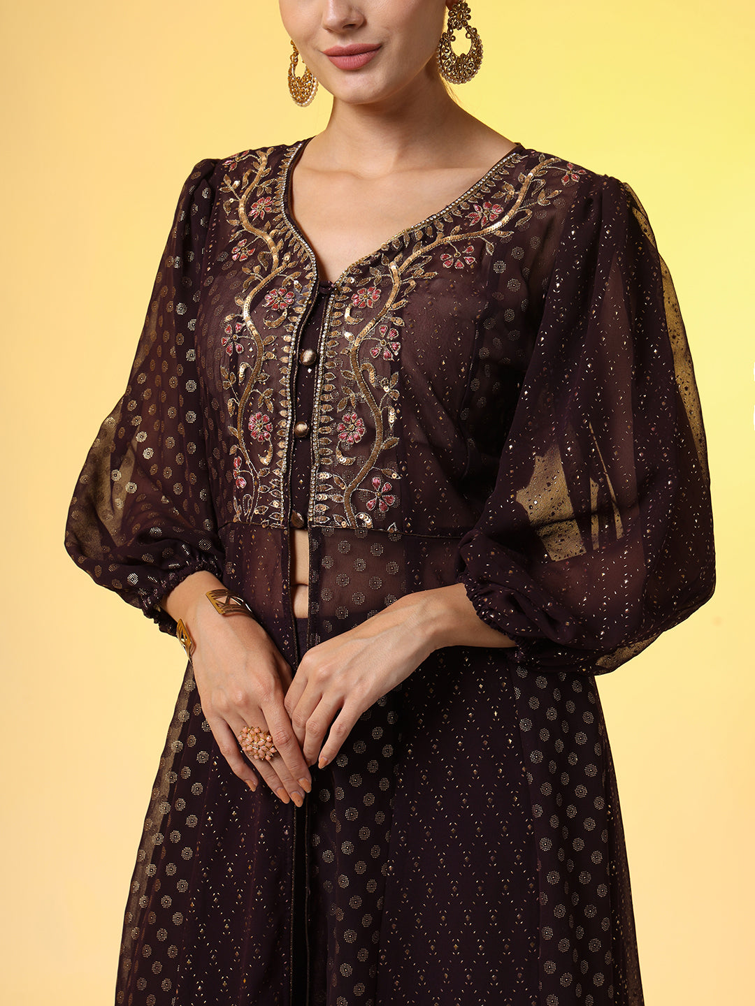 | "SUFIZA" Zardosi Hand Embroidery Georgette Foil Print Ethnic Dress |