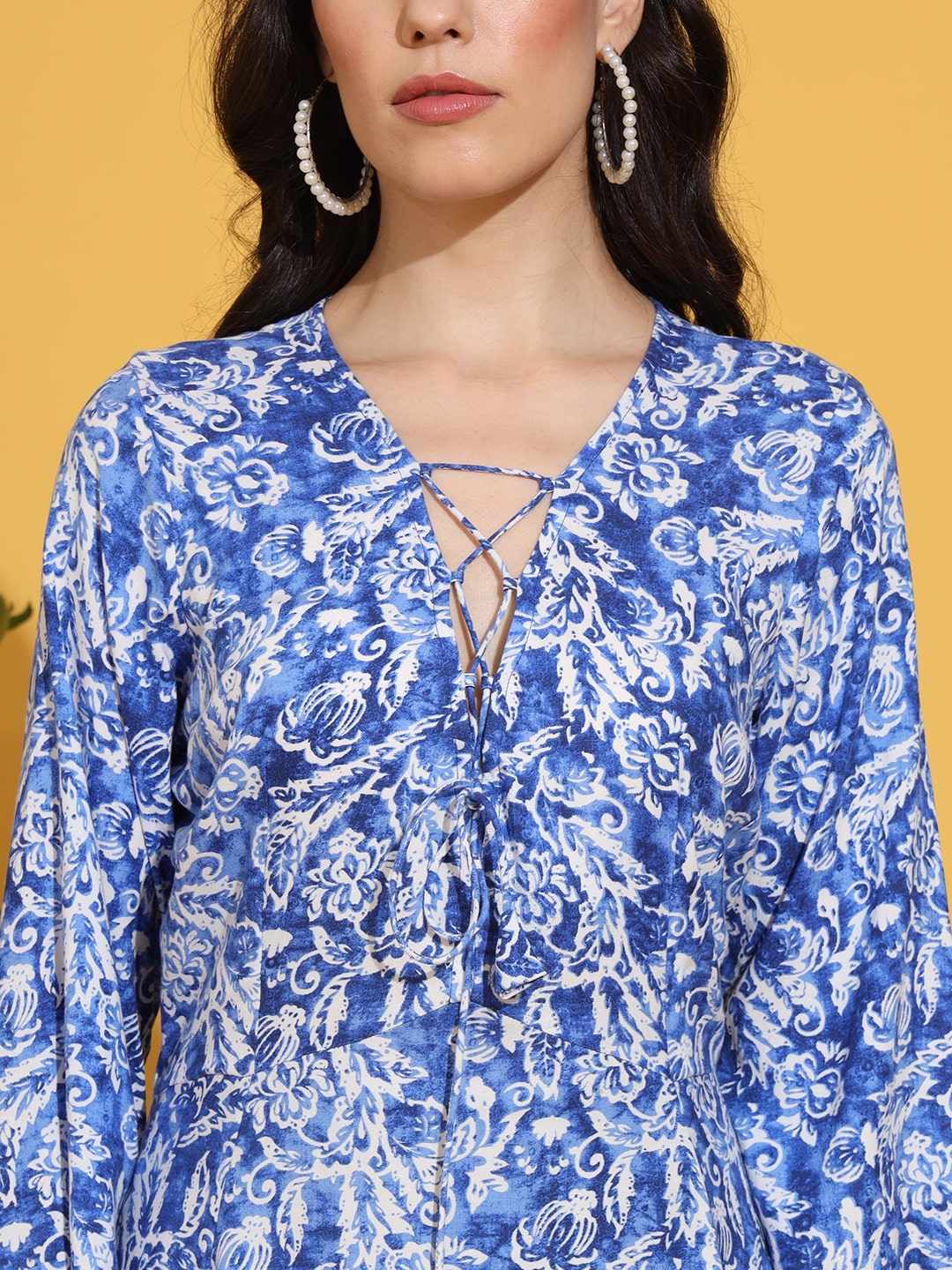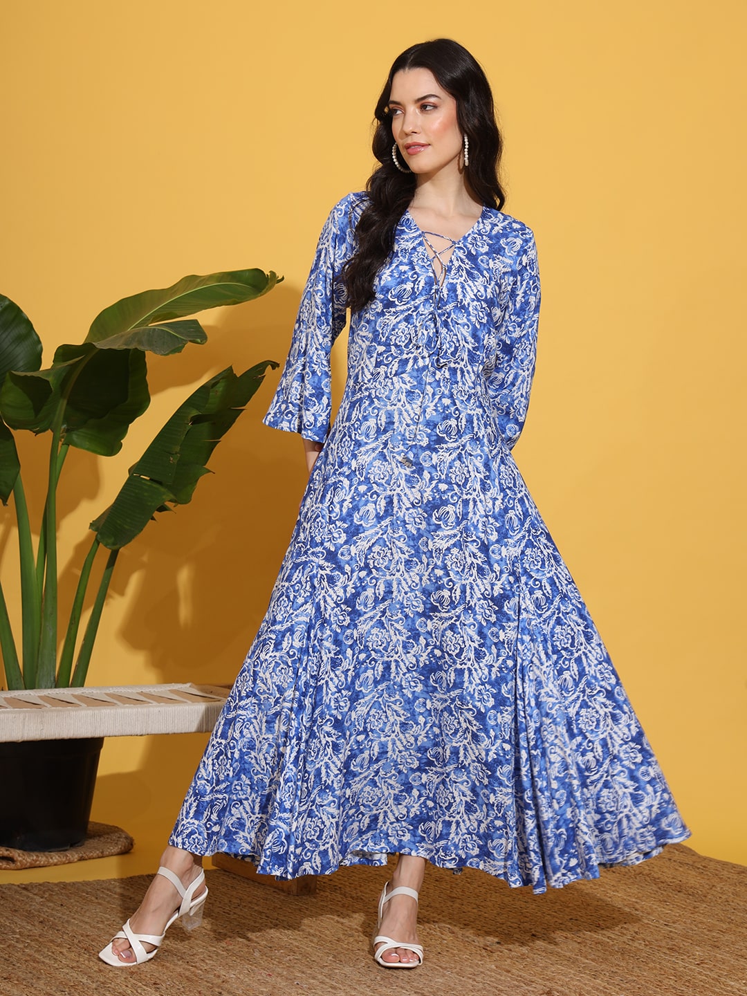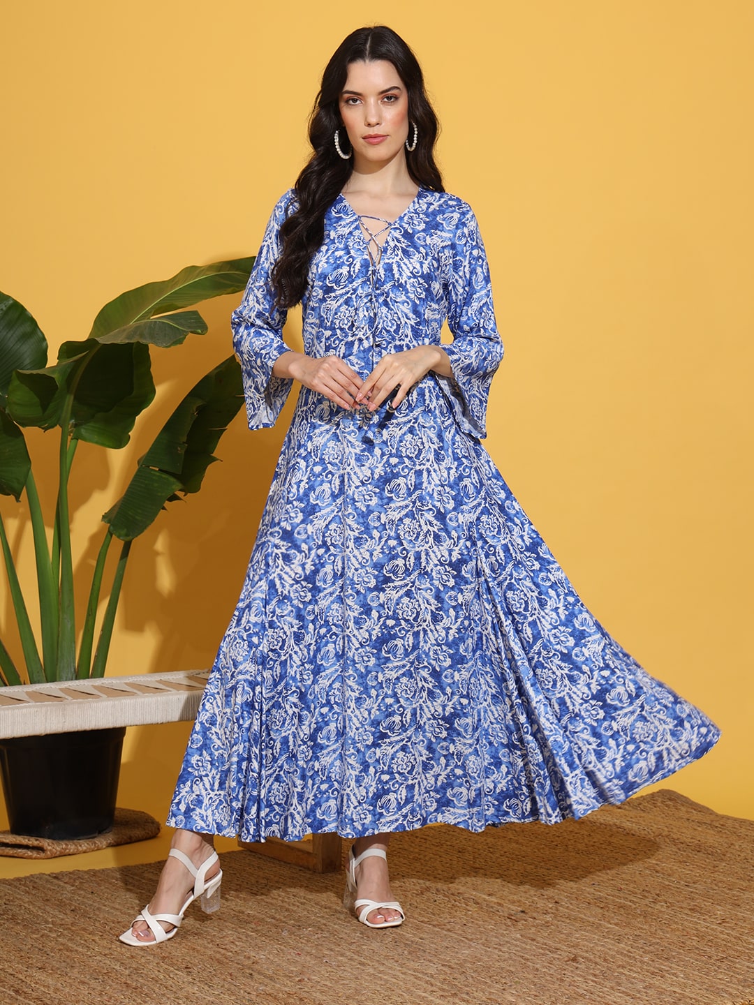 The "SUFIZA" Full Length Blue with white flower printed motif, Perfect wear for casual and party wear with its bell sleeves and unique neckline style. Accurate full length for the age group of 18 to 50 years. Unique collection to your wardrobe.