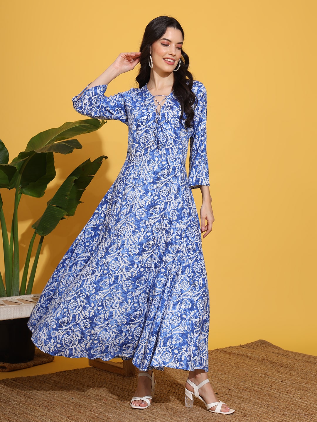 "SUFIZA" Full Length Blue with White Flower Printed Motif