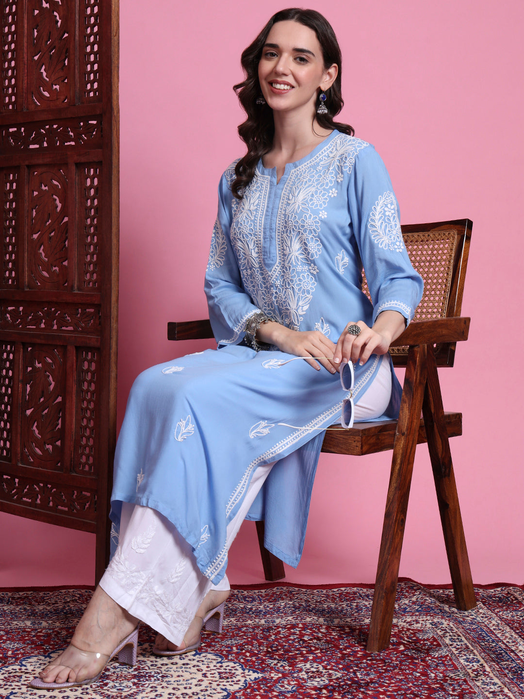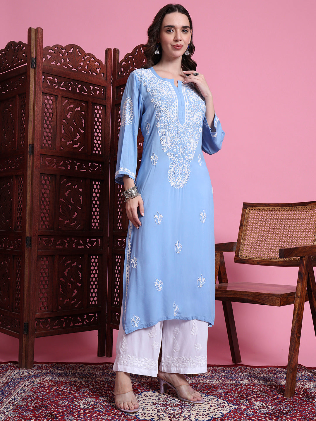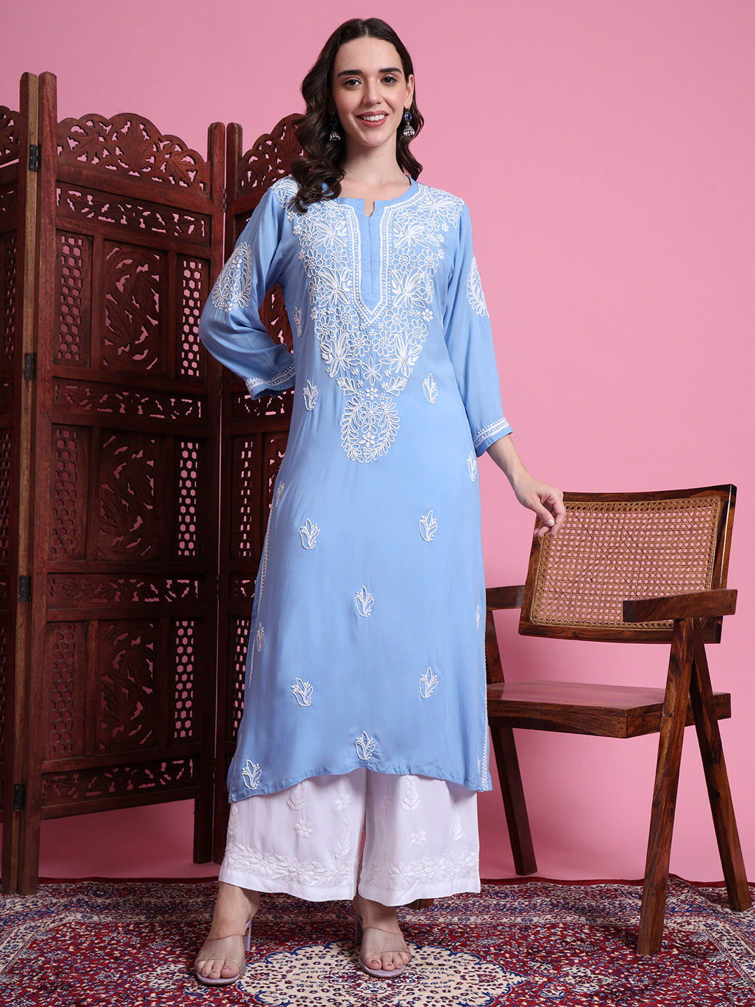 The "SUFIZA" Chikankari Hand Embroided Blue Color Kurta perfect Office and Casual Wear. The Kurta is 45 inches long Straight Style. Perfect Kurta to look different in the crowd.