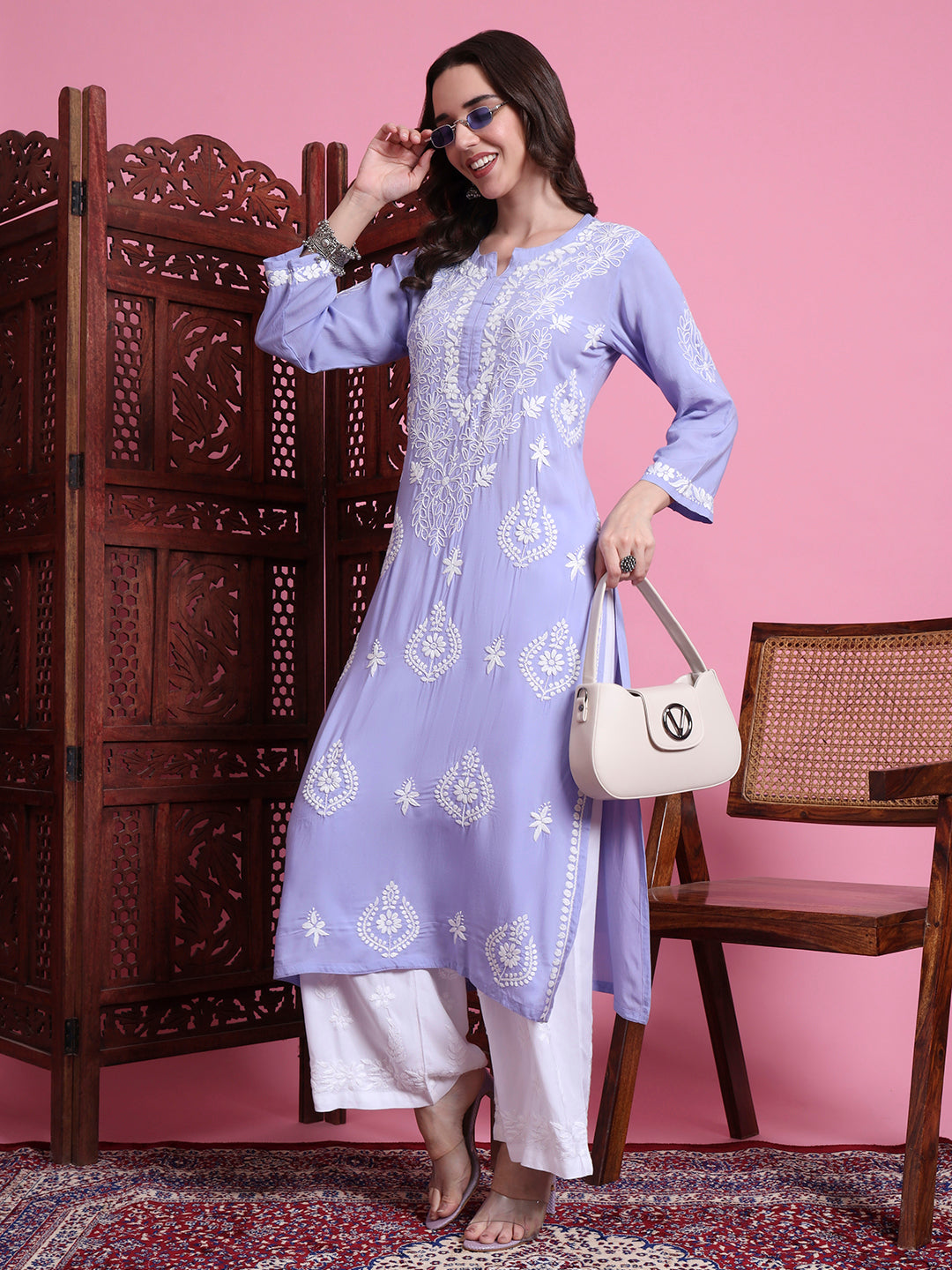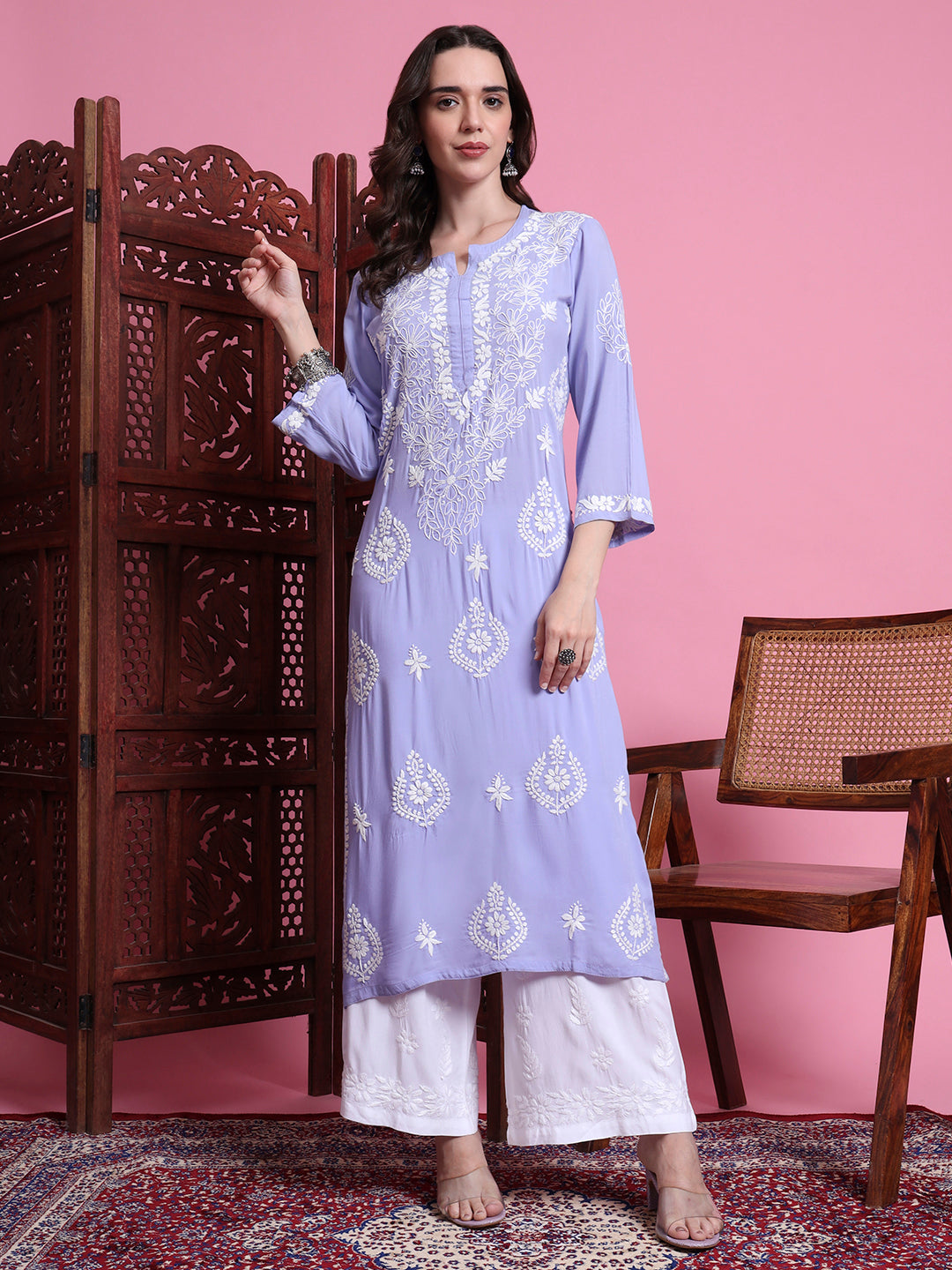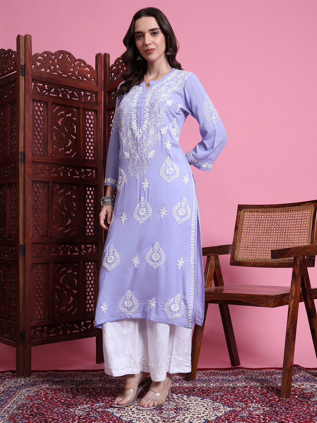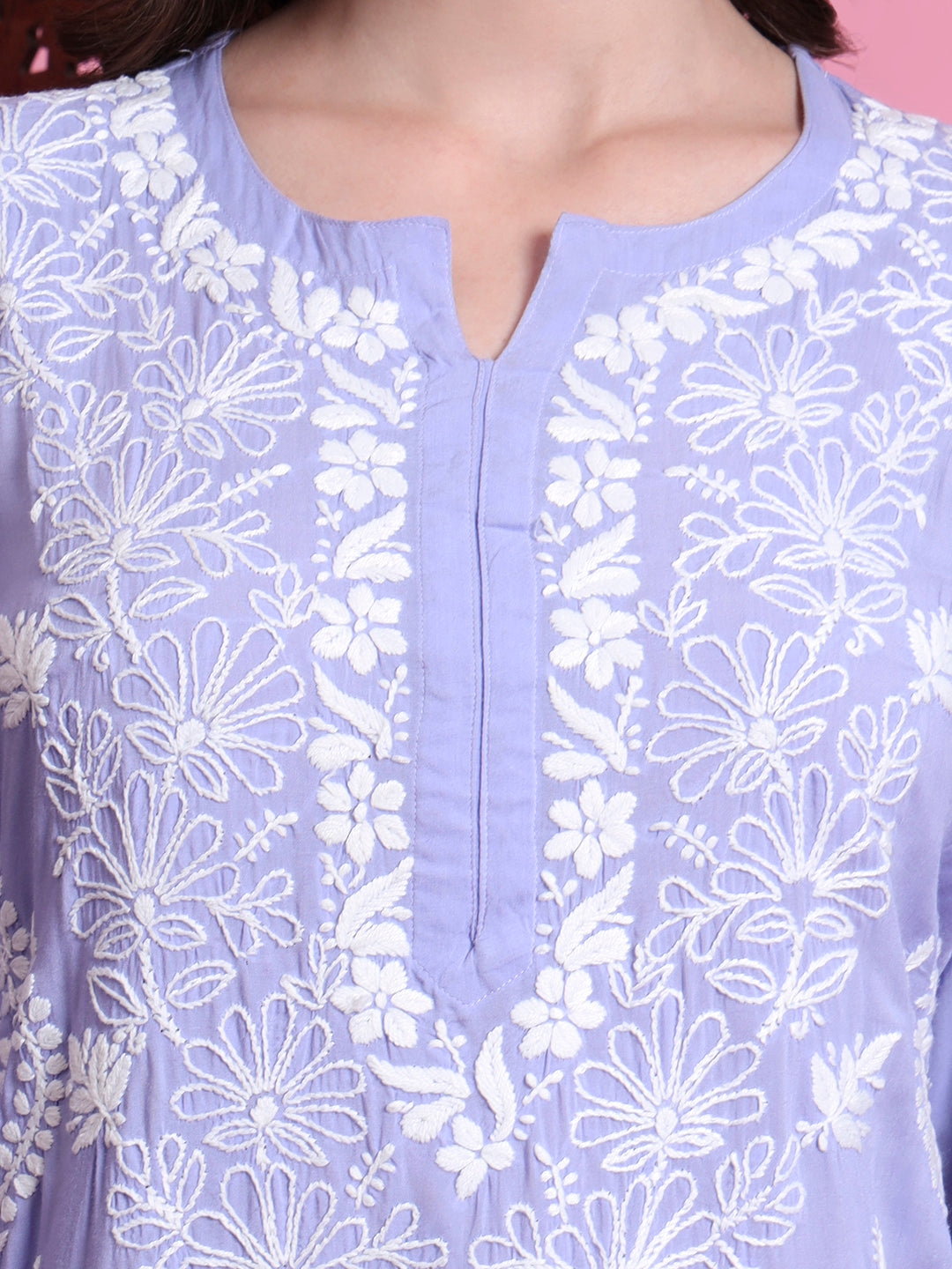The "SUFIZA" Chikankari Hand Embroided Purple Color Kurta perfect Office and Casual Wear. The Kurta is 45 inches long Straight Style. Perfect Kurta to look different in the crowd.
