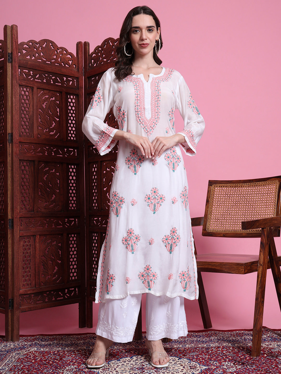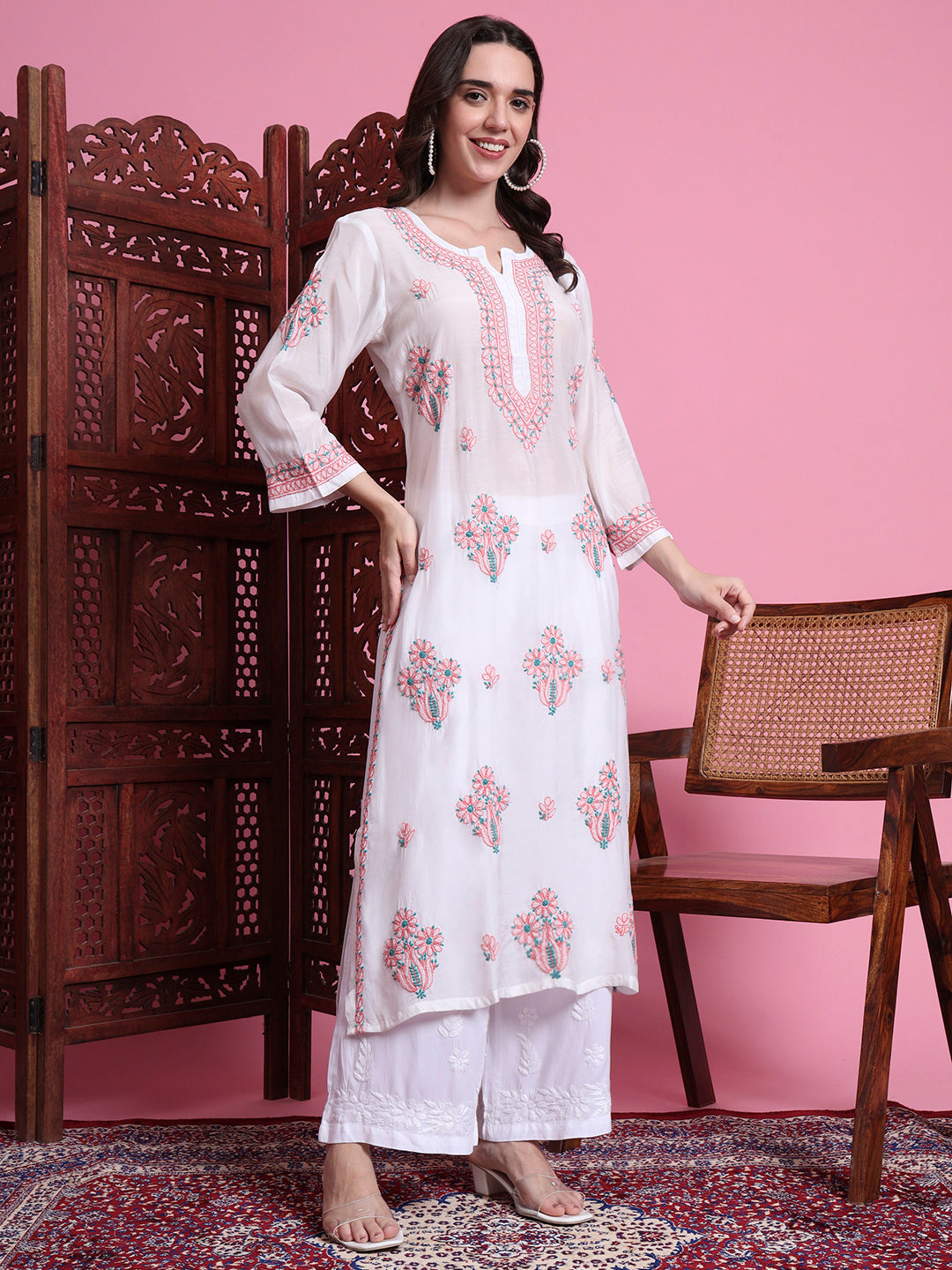 The "SUFIZA" Chikankari Hand Embroided White Color Kurta perfect Office and Casual Wear. The Kurta is 45 inches long Straight Style. Perfect Kurta to look different in the crowd.
