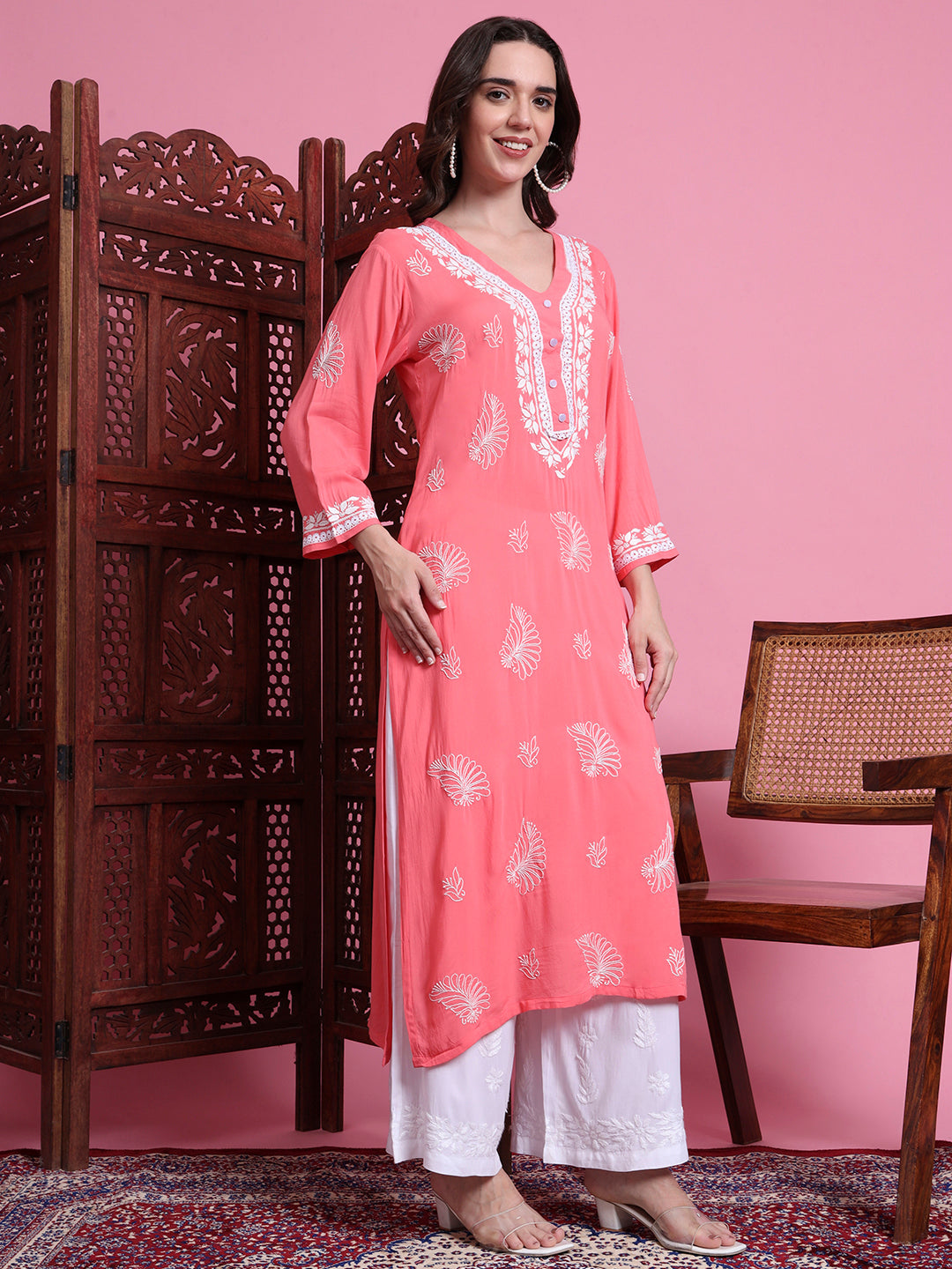 The "SUFIZA" Chikankari Hand Embroided Peach Color Kurta perfect Office and Casual Wear. The Kurta is 45 inches long Straight Style. Perfect Kurta to look different in the crowd.
