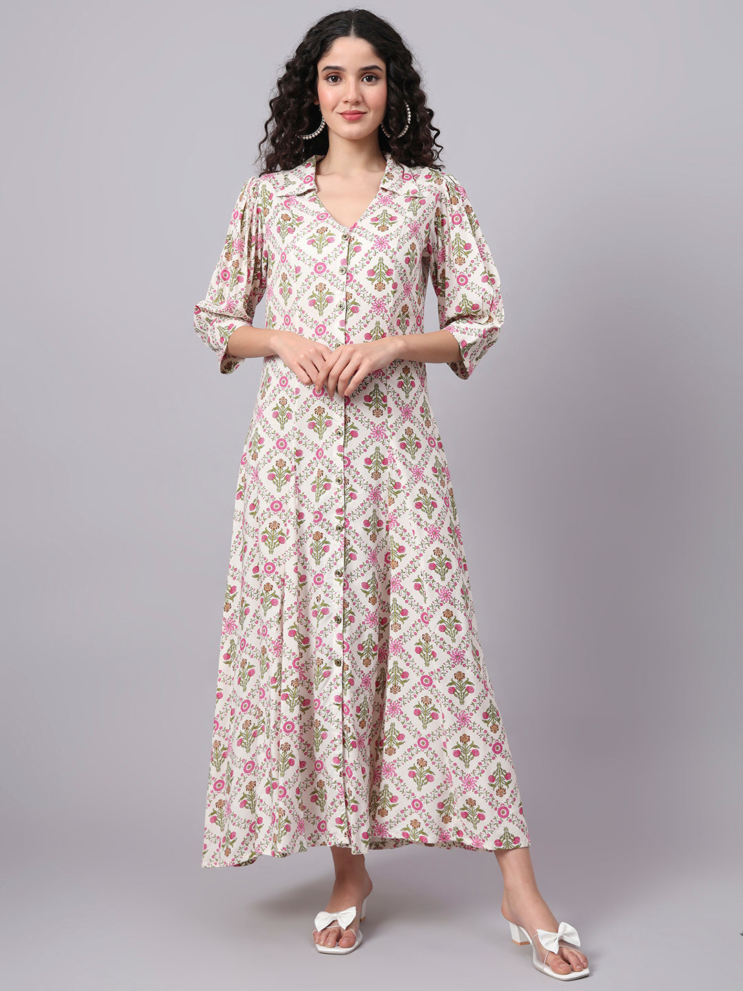 Viscose Rayon Cream Printed midi Dress S3004-A