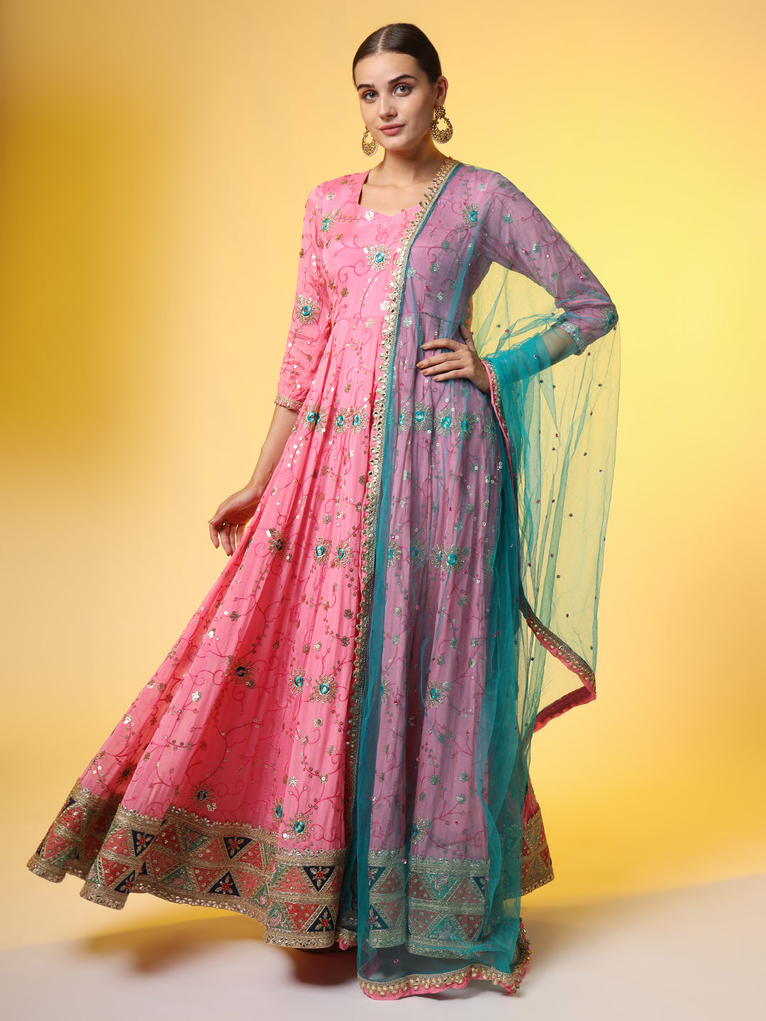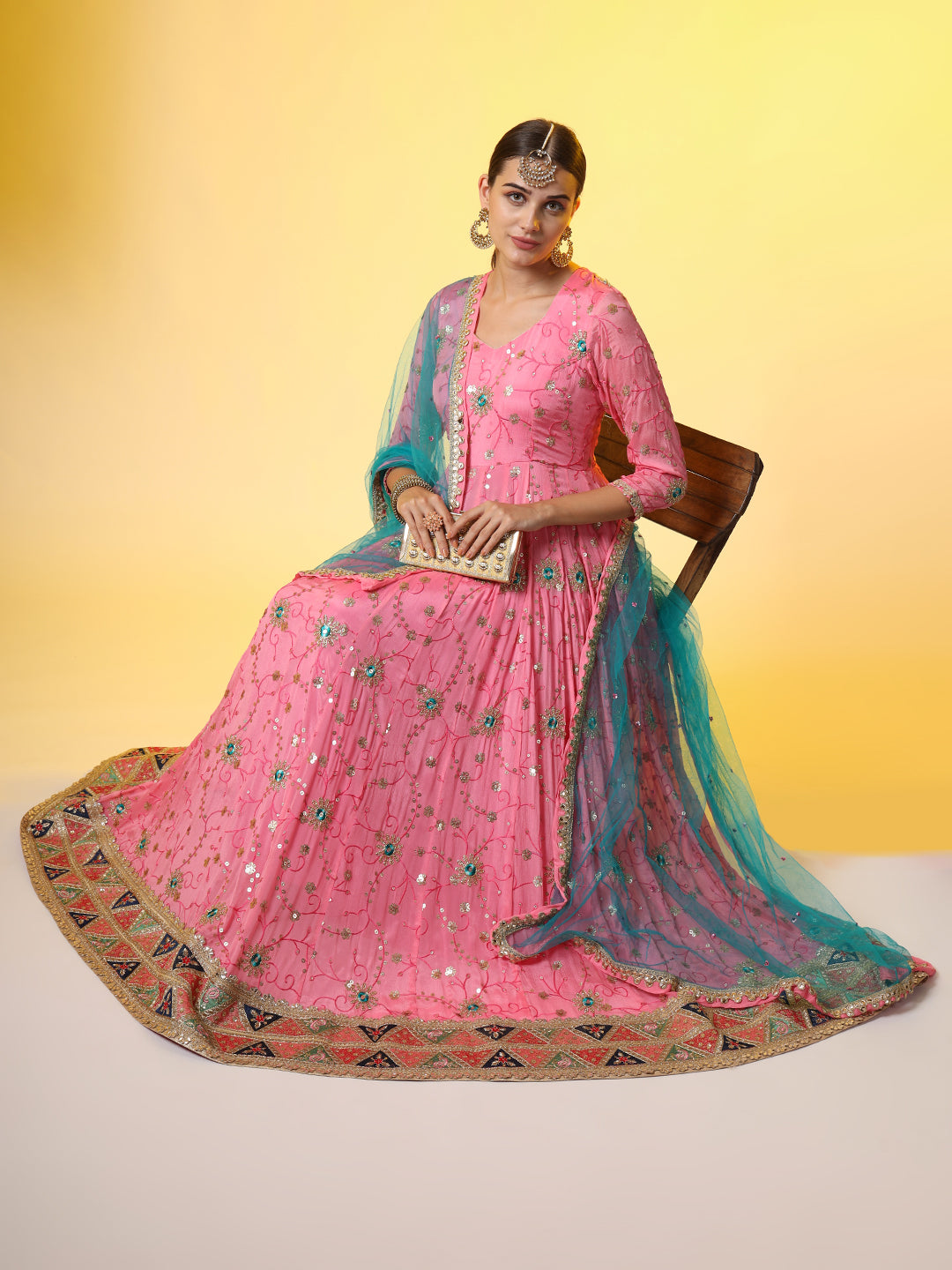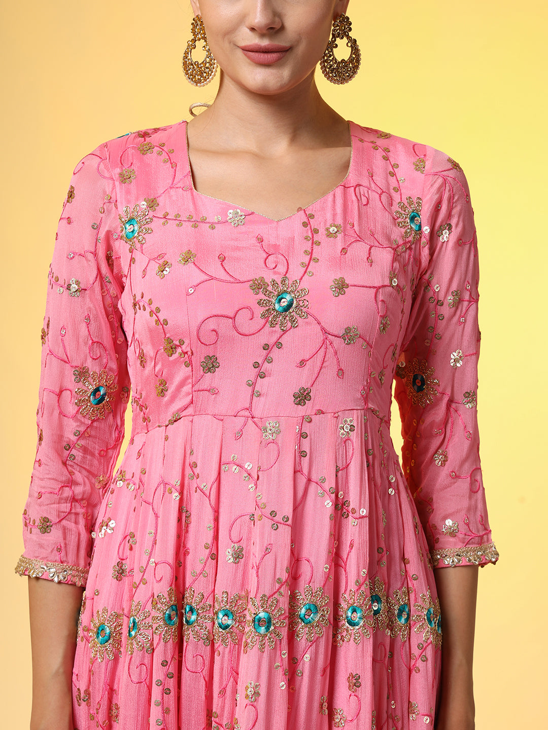 | "SUFIZA" Pink Golden Embroidery Ethnic Dress With Matching Dupatta |