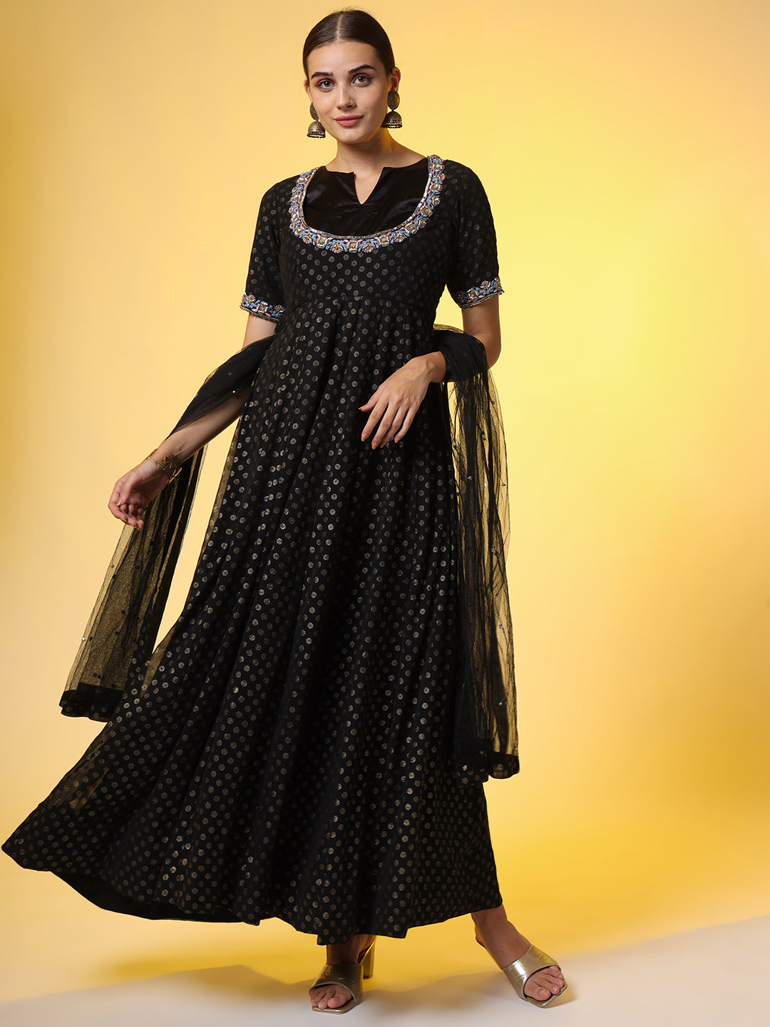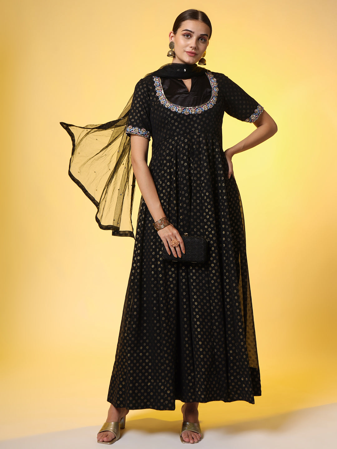 | "SUFIZA" Zardosi Hand Embroidery Foil Print Georgette Ethnic Dress with Matching Dupatta |